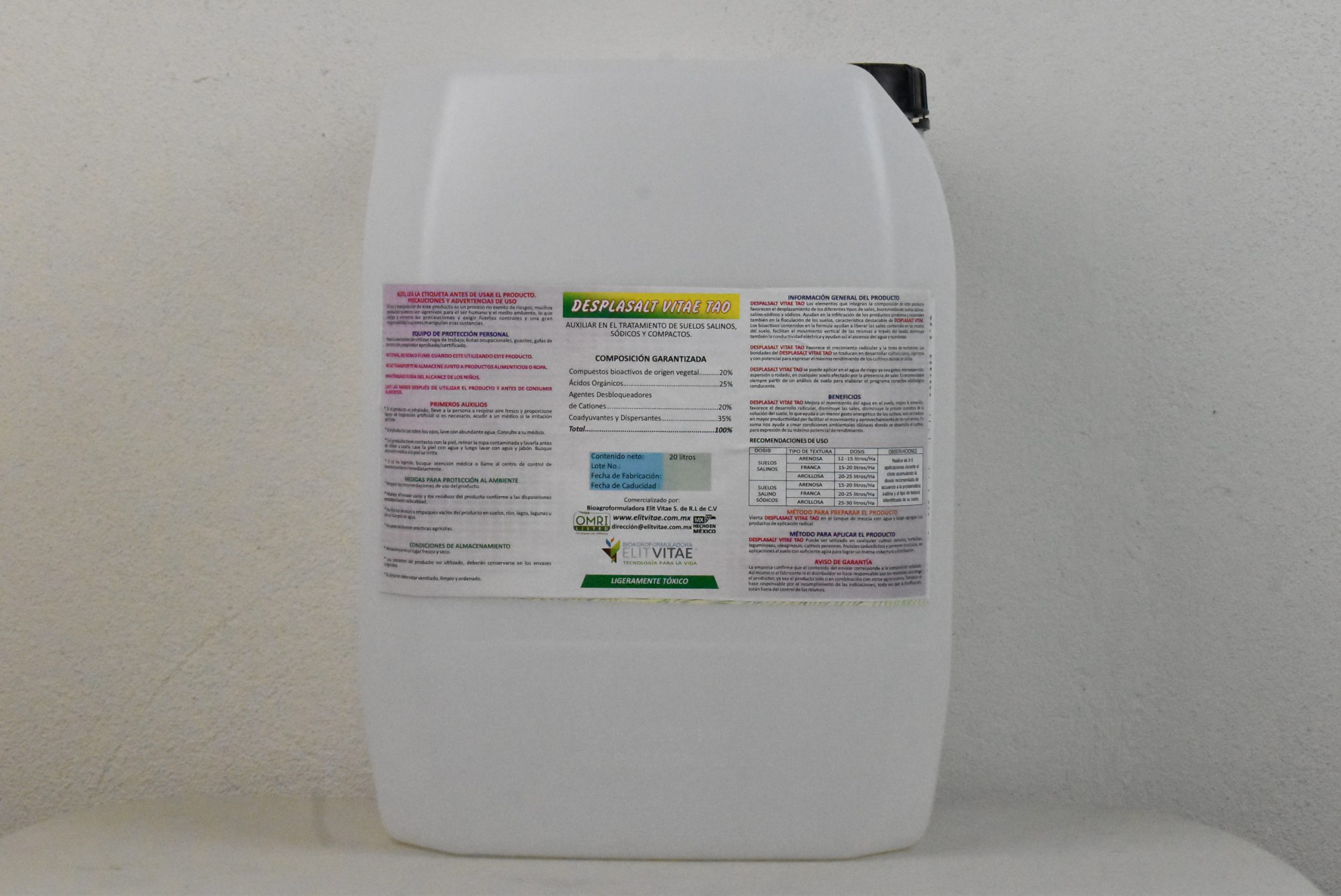 DESPLASALT VITAE TAO Es un producto ORGÁNICO con CERTIFICADO OMRI que favorece el mejoramiento de los suelos con problemas de sales ya que los elementos que integran la composición de este BIOPREPARADO favorecen el desplazamiento de los diferentes tipos de sales infiltrándolas y neutralizándolas, además de mejorar la conductividad hidráulica, floculación y cementación de los agregados del suelo.